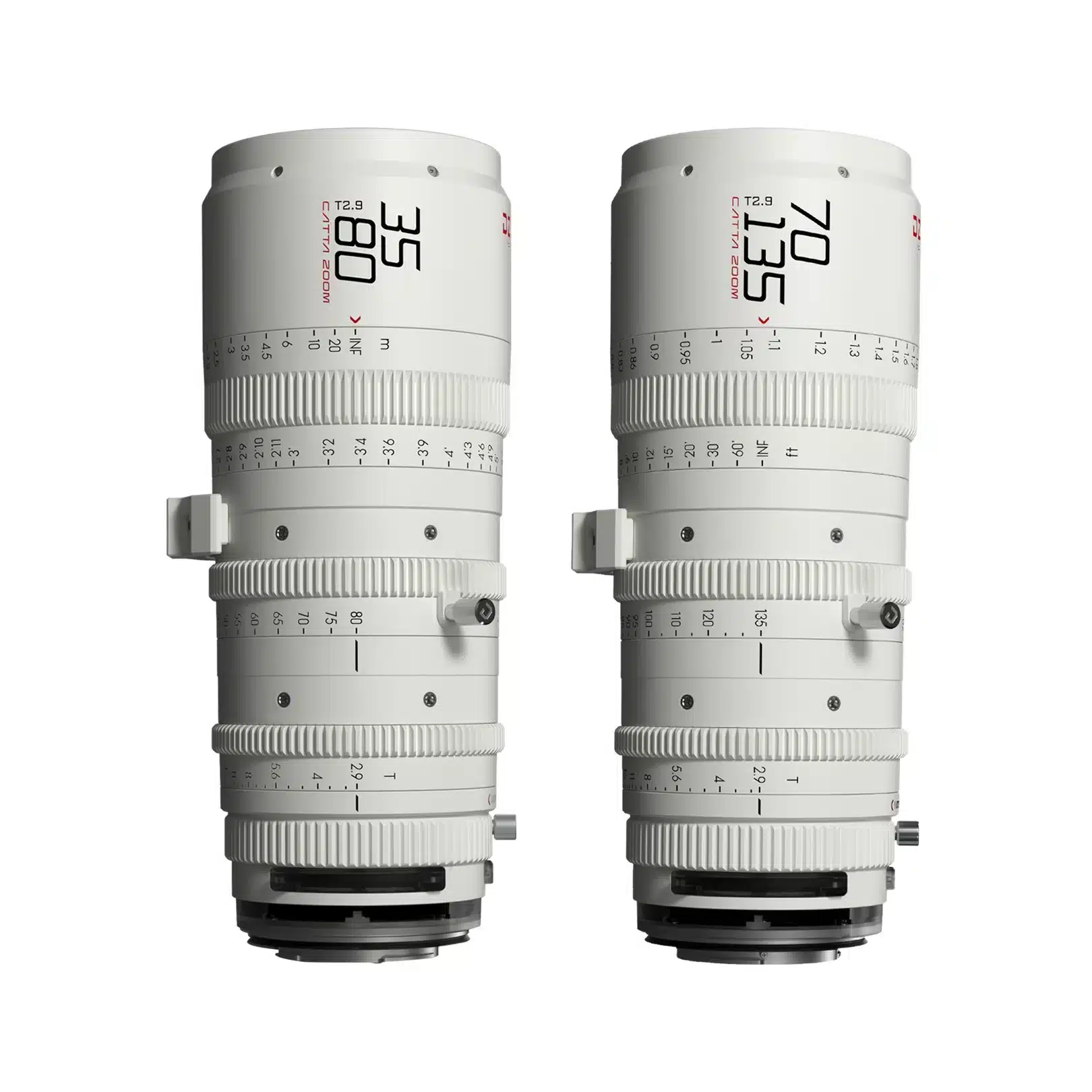 DZOFilm Catta 35-80 & 70-135mm T2.9 E-Mount Cine Zoom 2-Lens Bundle is a fantastic value package that includes two high-quality cinema zoom lenses, the Catta 35-80mm and the Catta 70-135mm, both of which come in a sleek white color. Additionally, the bundle includes a hard-shell case for safe transportation and storage.